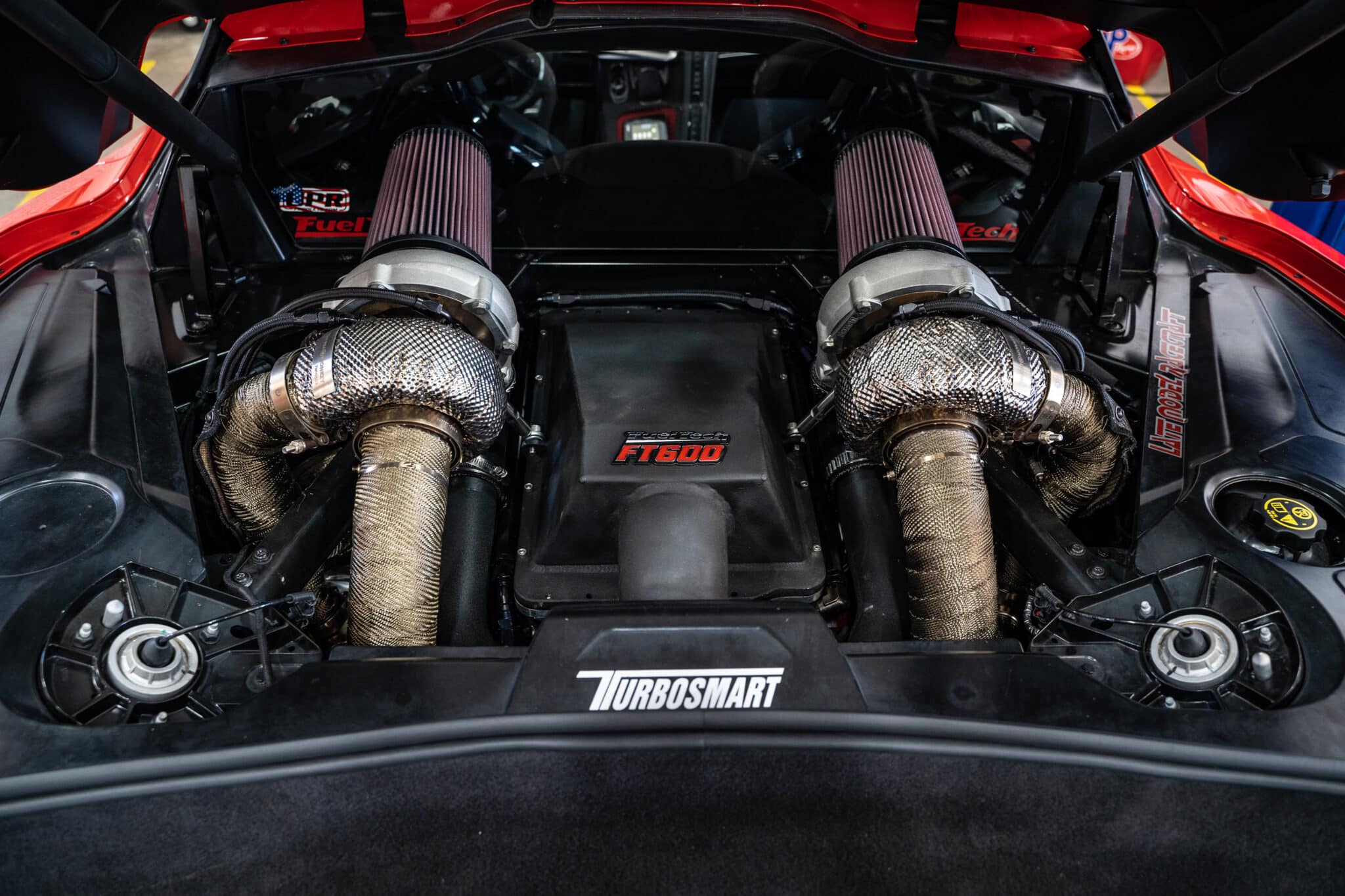 Since its release over a year ago, the C8 Corvette has become an icon of American muscle with supercar-like performance at a reasonable price. Dick and his FuelTech staff became enamored with the platform and were inspired by Late Model Racecraft (LMR) to develop a top-mount twin turbo combination. The aftermarket has yet to break into the factory ECU and offer custom tuning capabilities, but that wasn’t going to hold them back. The award-winning FT600 engine management system was integrated into the LT2 platform using a special jumper harness. The PowerFT ECU controls a supplemental fuel supply and other engine functions, enabling enthusiasts to add turbochargers and superchargers.