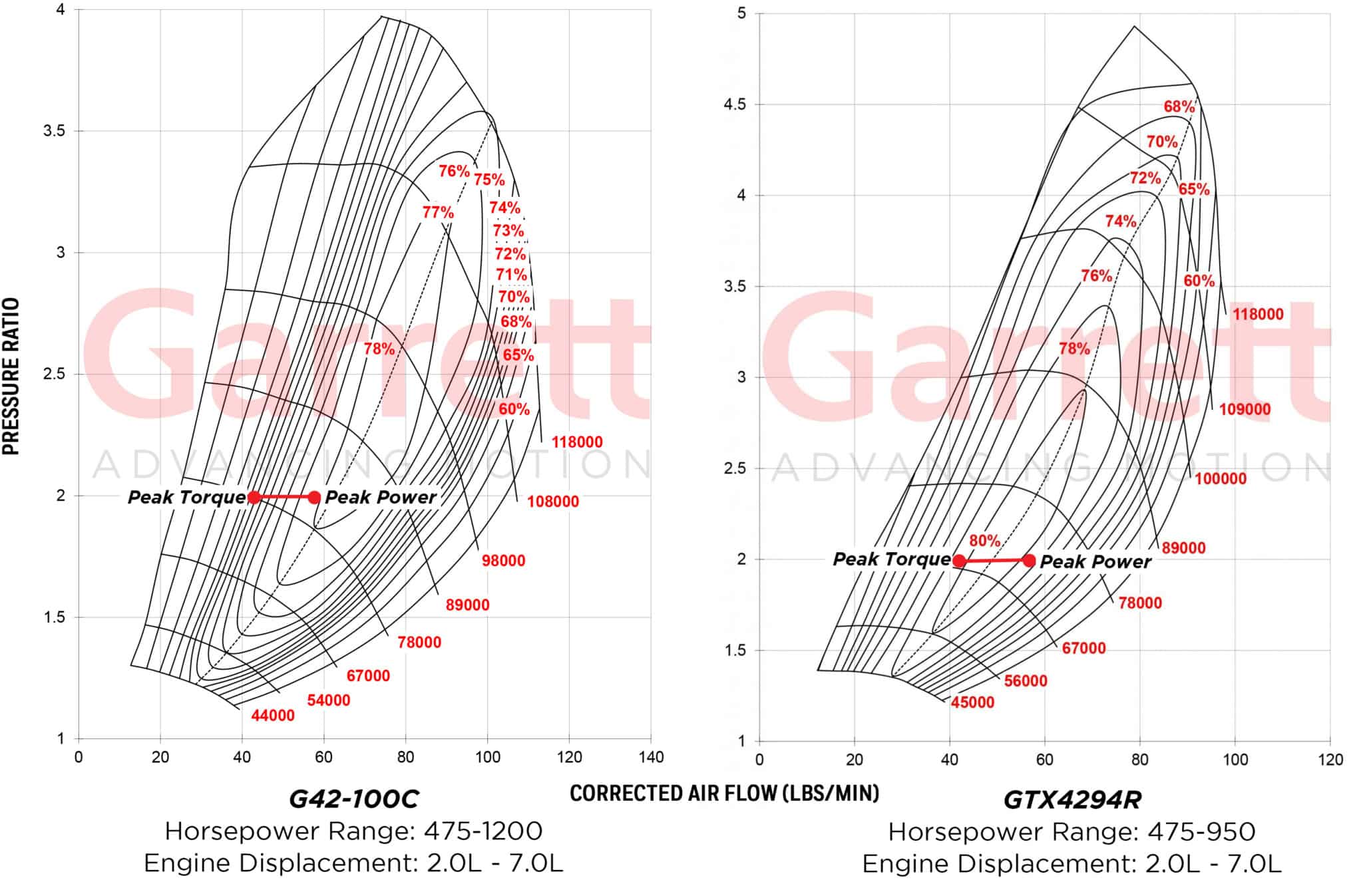 Two points have been calculated, one for peak horsepower and one for peak torque. These operate on the same pressure ratio because boost pressure is constant at these points. The GTX4294R compressor map is a better match for our target horsepower and pressure ratio goals because the range between peak torque and horsepower are in the most efficient part of the map which will provide cooler air to the manifold. The G42-1200 is in a lower efficiency zone that will provide hotter air to the manifold. Both compressors allow room for additional power since peak power point is almost in the center of the map with room from the choke line. Since we are away from the choke line, the turbo is not spinning at max RPM.