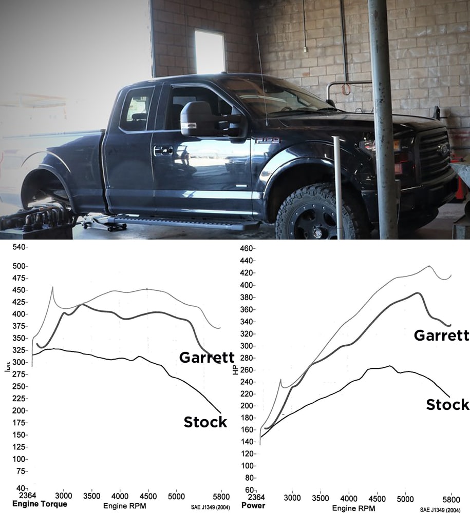 Turbocharger upgrades increase the size of the compressor wheel to flow more air at the stock RPM and boost pressures. This keeps the turbocharger in an efficient range, keeping air temps low while making more power continuously. Garrett has engineered an intercooler and twin turbo upgrade specifically for the 3.5L Ford EcoBoost engine platform.