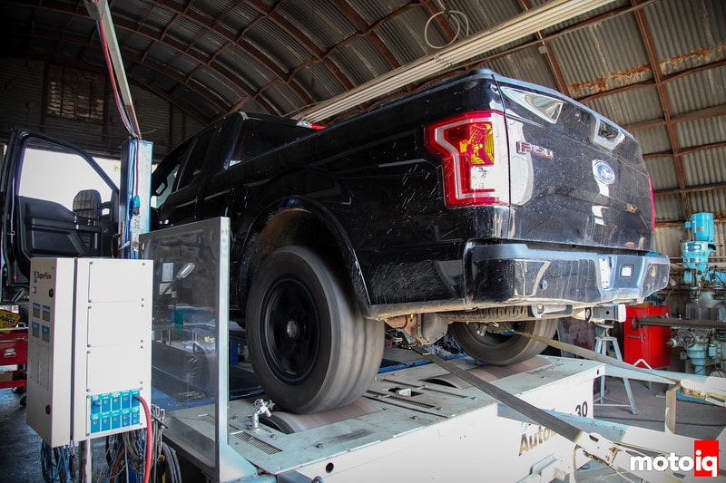 Before we started bolting on the aftermarket Garrett goodies, we wanted to test a couple more things while the car was still in stock form. Like we mentioned earlier, the factory turbos and intercooler work well for what they were designed for, but we were wondering what exactly happens when one of the many off the shelf tunes available for the Ecoboost engine is used. After loading a new tune to our project it was time to spin the roller again. With the turbo compressors way out of their efficiency range, due to the tune’s higher than stock boost pressure, the charge temps coming out of the turbos were about 450F degrees! After the intercooler, the temps were still a frying 270F degrees! That’s a difference of over two hundred degrees in inlet temp and almost one hundred degrees in outlet temps. This is seriously not good for your engine! This was still pretty darn hot and we don’t feel it is safe to run your F-150 EcoBoost on just a tune. Yes, it will make more horsepower, but those inlet and outlet temperatures are unacceptable and will not yield good results in the long run.