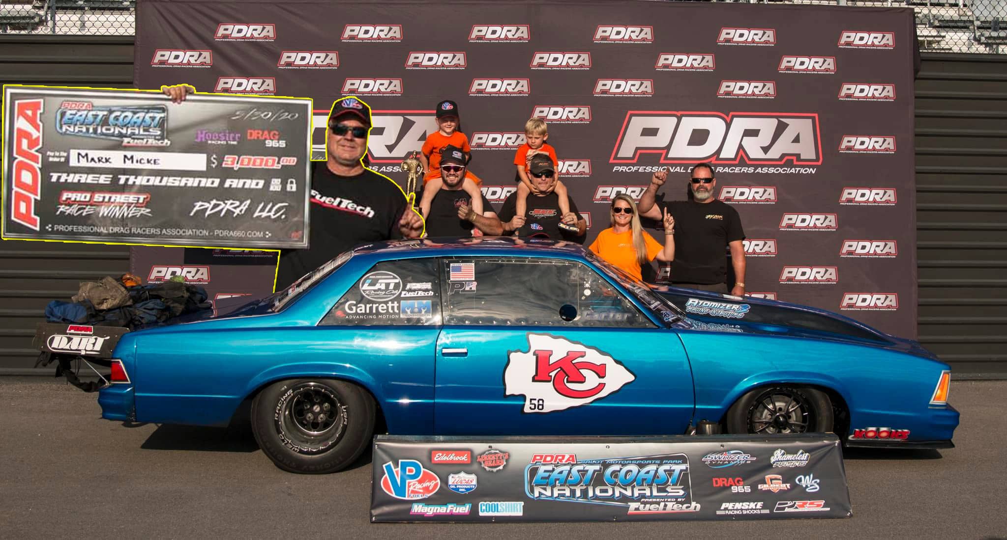 Mark Micke brings home his first win of the 2020 drag racing season at GALOT Motorsports Park in the PDRA Pro Street Class. The 78 Malibu ran consistent all weekend and won the final round with a 4.05 second 1.8th mile at 194 MPH. The PDRA Pro Street class is a 88mm turbo class and the Malibu ran with the GTX5533R Gen II turbochargers. Mark Micke is the owner of M&M Transmission and the driver of the Malibu while Jason Carter owns the car. The two have been a team for more than ten years and have relied on Garrett GTX Turbochargers to boost the 4000 horsepower big block chevy engine. For more updates follow M&MTransmission on FB and @Carter_Micke_Racing on IG