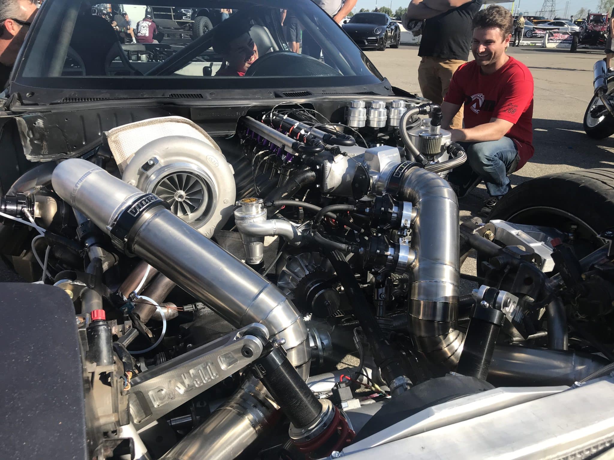 Now fast forward a few years to March of 2020, the RX7 has a running motor and transmission and hit 1000 horsepower on the dyno (click to see the video) not just once but many times. He’s well on his way to making his dreams come true with the car. In a crowd pleasing debut, Rob took the car to the 2020 Hoonigan Burnyard Bash in Irwindale, CA, hooked the car up to a container and roasted a fresh set of Toyo Tires in homage to Ken Block’s all wheel drive burnout in the Gymkhana series.