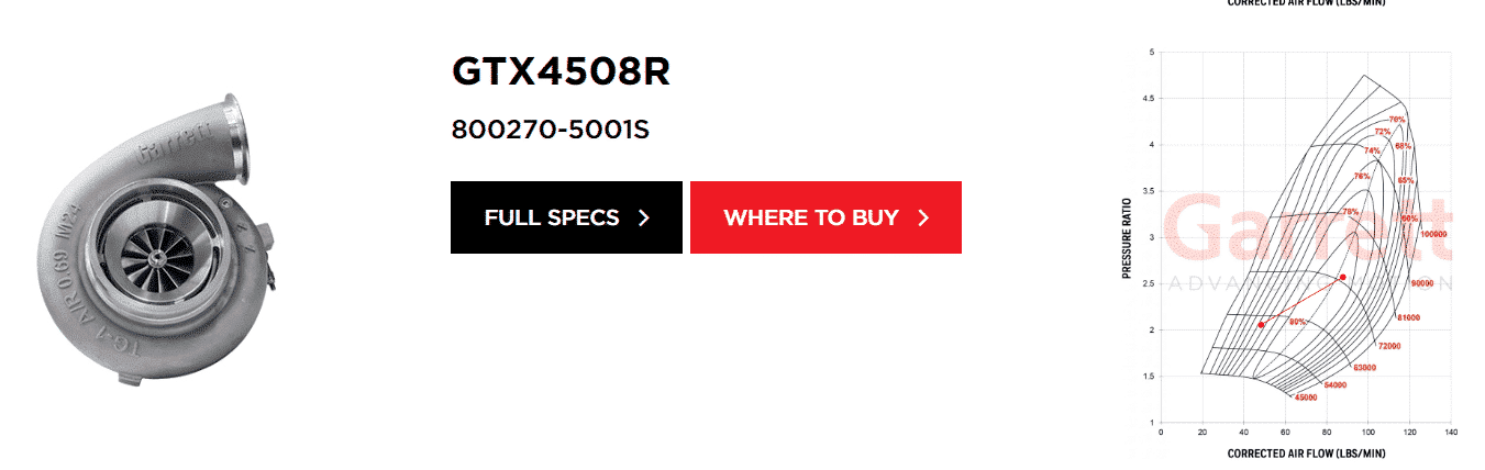 Being a turbo engine guru, Shane has always been a huge turbo fan since he first got into cars. « From the way the power comes on, to the sound they make, a huge benefit to a turbo is the ease of adding power. No need to change out nitrous jets, swap pulleys, or ever worry about throwing a belt off. The power is always there, and can be turned up with the turn of a knob, or click of a button, » says Whalley. For this build he chose a single Garrett GTX4508R because it supports up to 8.0L engines and can make up to 1250 horsepower. By using the Garrett Boost Adviser matching program you can see why the GTX4508R is a good match for a 1000 horsepower 5.7L engine by looking at the two redlines on the compressor map. The line on the right represents max power and it falls in the most efficient part of the compressor map producing cooler air than other parts of the map helping to increase the volumetric efficiency of the engine.