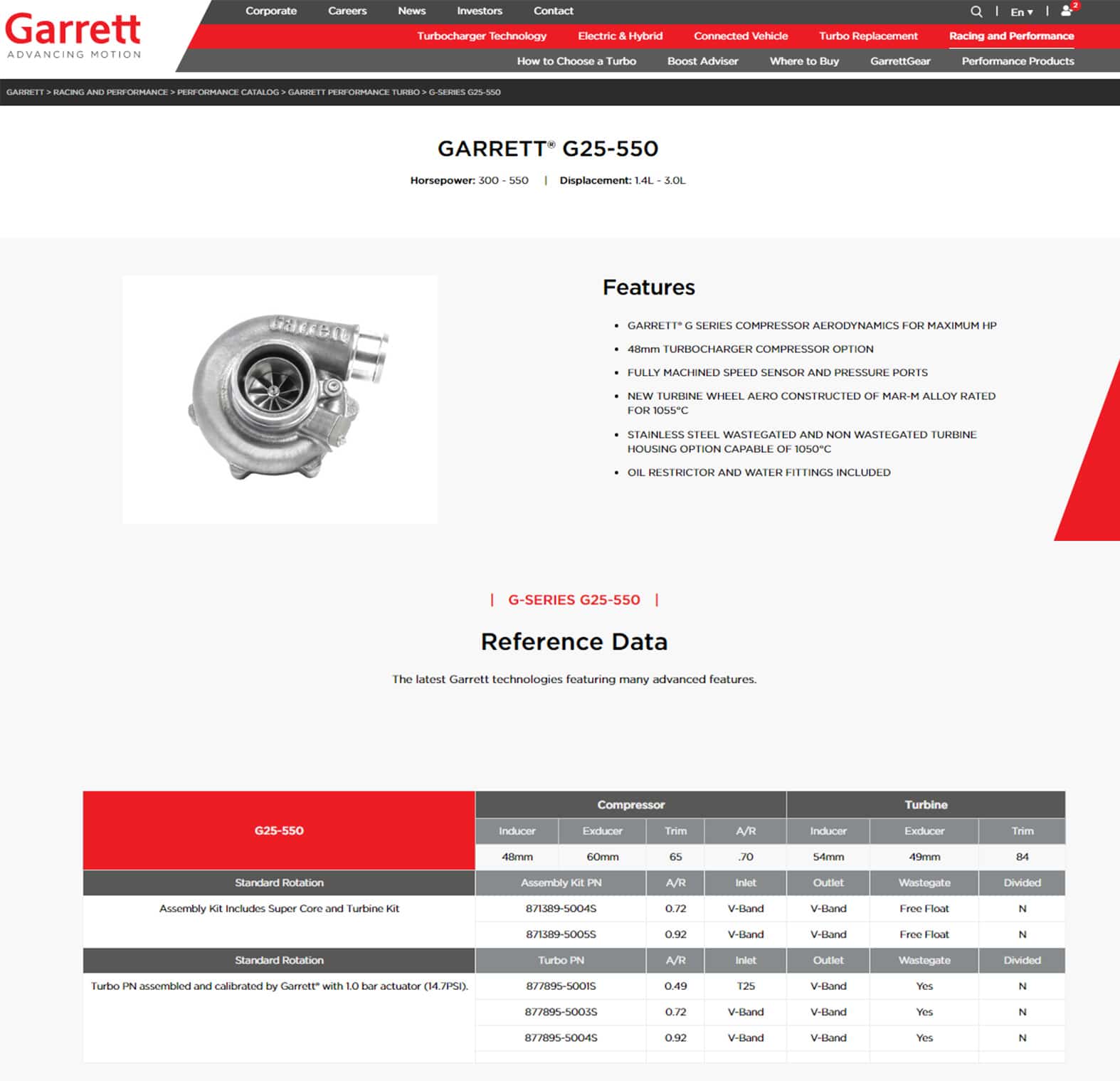 G Series G25-550: 300-550 horsepower and 1.4L- 3.0L displacement. The turbine housing inlet options are available in mostly V-band with one T25 option. Our horsepower needs are within the turbo range. Displacement is also between the range. The G25-550 is offered in standard and reverse rotation for mirrored setups. This turbo is a much better match option than the GTX3071R Gen II.