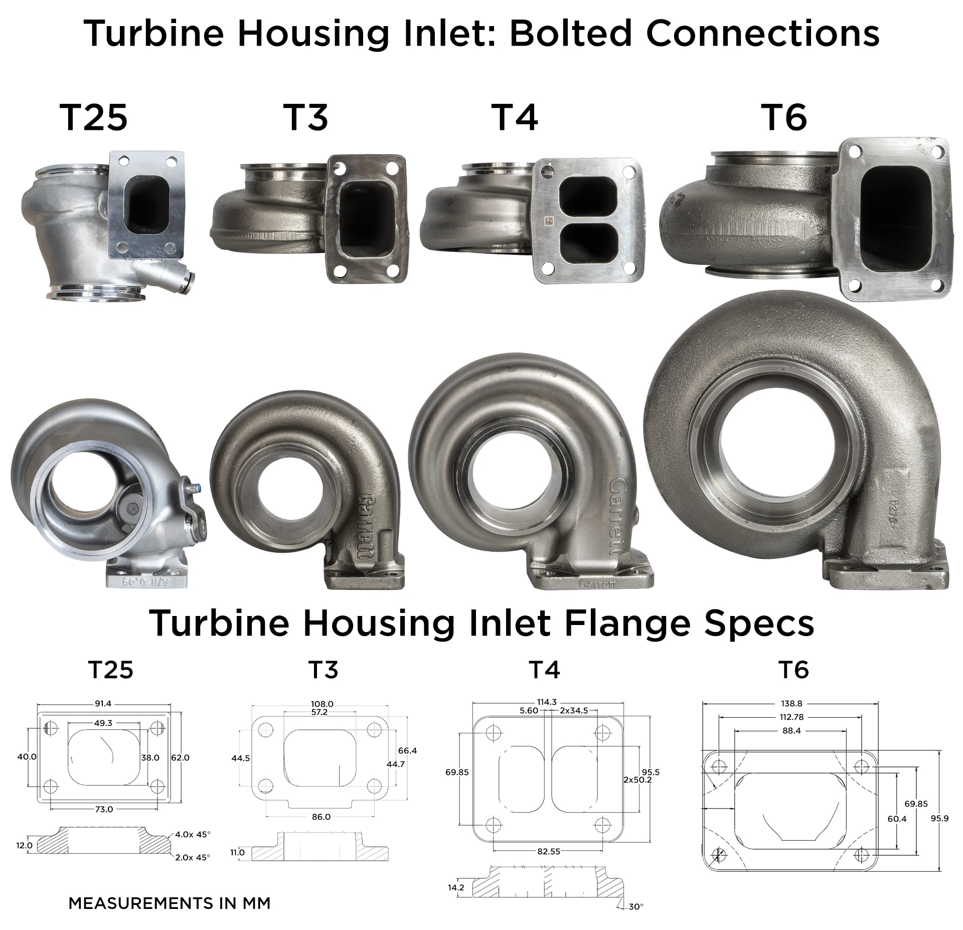 Turbine housing inlet flange– Depending on the size and manufacturer of the turbo, there are several types of turbine housing inlets, all with different dimensions. Smaller turbos use smaller inlet flange types like T25, while large turbos use larger flanges like T6. Garrett engineers flow test and match the turbine inlet size with the turbocharger’s performance specs. Garrett performance turbine housings are offered in T25, T3, T4, T6, and V-Band turbine housing inlet connections.