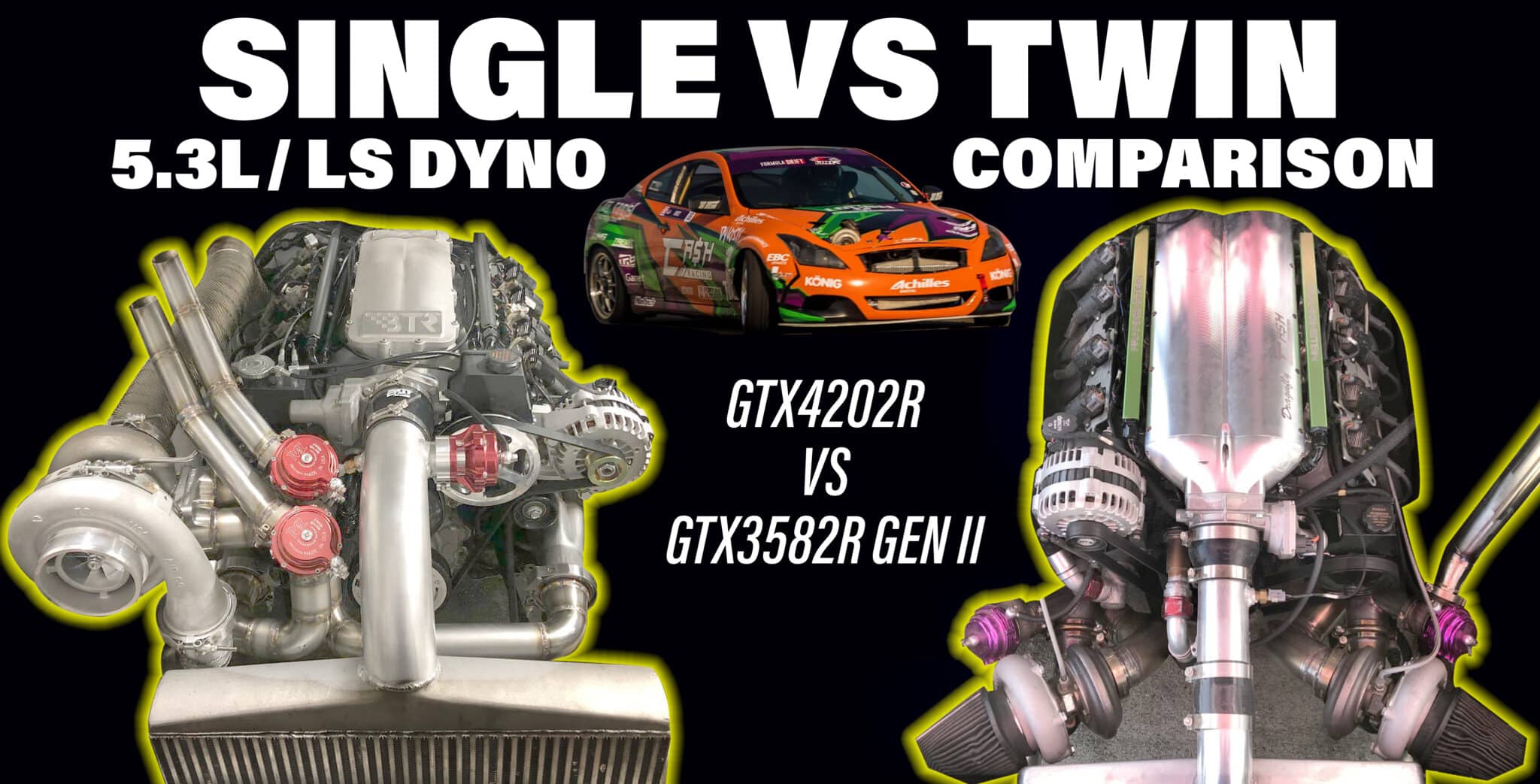 Is a single turbo setup or a twin turbo setup better for an LS engine? There are a lot of theories about what turbo setup is best for an LS based engine platform, and with so many styles of driving and racing it would be impossible to compile a complete guide with data that could argue pros and cons for all the options and all the different horsepower ranges. Instead, what you will find in this write up is a dyno graph comparison between a single Garrett GTX4202R turbo and twin GTX3582R Gen II turbos on the same 5.3L LS engine with an 800 horsepower tune. Both of the turbocharger setups are capable of making more power, and they both have, but for an accurate comparison we are looking at the “race tune” used by for Formula Drift Pro 2 racer, Jonathan Hurst.