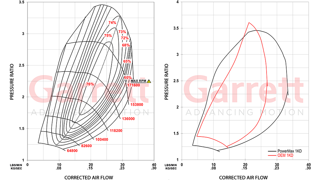 The Garrett PowerMax™ turbocharger is engineered as an OEM-plus upgrade, designed to retain factory fitment while increasing airflow and overall performance capability compared to the original equipment turbocharger.