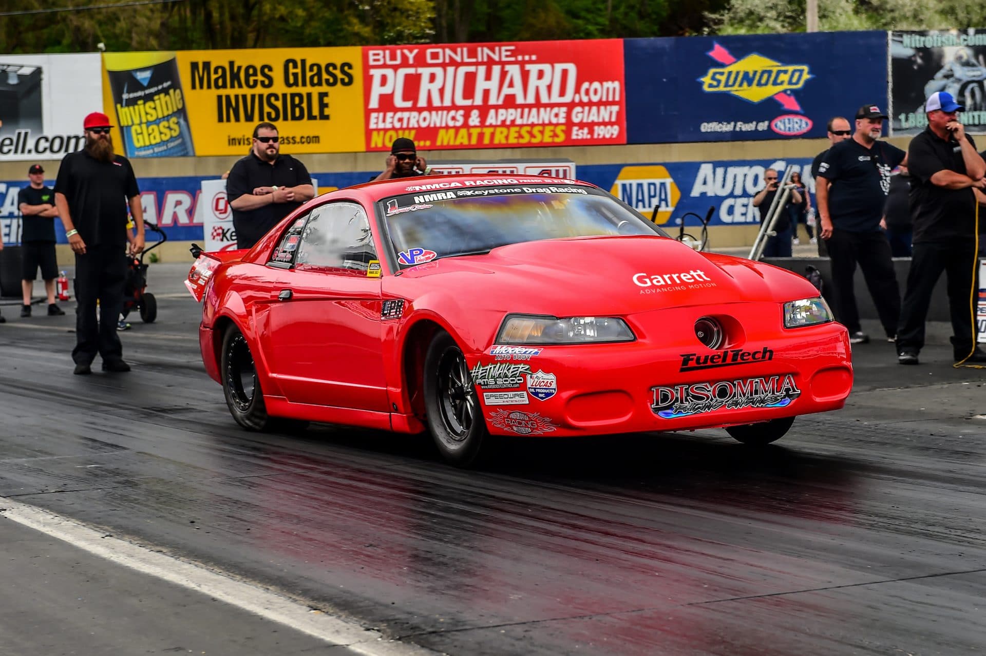 Take a look at this Ford Mustang Drag car featuring a Disomma Race Engines 400 cubic inch small block Ford. Single turbo drag racing classes making big power with GTX5533R Gen II turbochargers in classes like NMCA Street Outlaw and X275. Both classes only allow a single power adder as part of the rule set. This setup utilizes a single Garrett GTX5533R Gen II 98mm turbocharger with a T6 1.78 A/R turbine housing. The large A/R turbine housing maximizes air flow and top end power.