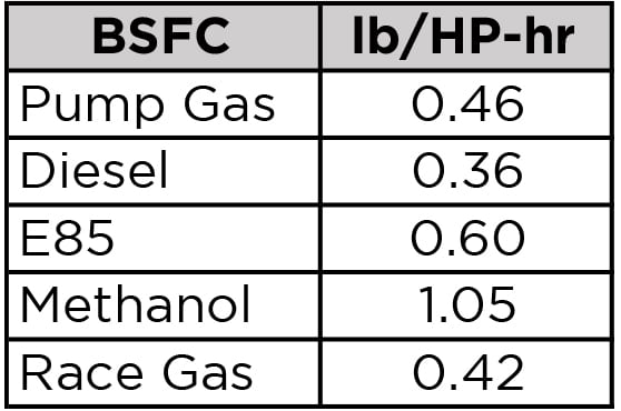 Brake Specific Fuel Consumption: (BSFC). BSFC describes the fuel flow rate required to generate each horsepower. General for turbocharged gasoline engines range from 0.50 to 0.60 and higher. Lower BSFC means that the engine requires less fuel to generate a given horsepower. Race fuels and aggressive tuning are required to reach the low end of the BSFC range described above.