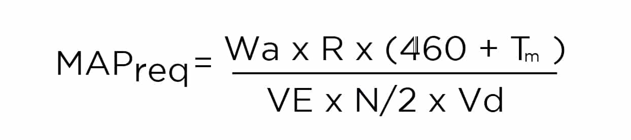 Mass Flow Rate is the volume of air flowing through a compressor and engine over a given period. This is commonly measured as lbs/min of air flow. This calculation tells us the air flow we need to support our required horsepower target. As a general rule of thumb, Garrett GTX Gen II and G Series turbochargers have the potential to make 10-11 horsepower per every 1 lbs/min of air flow however there are many factors that will impact actual power output including Volumetric Efficiency, fuel type, and others we will discuss below.