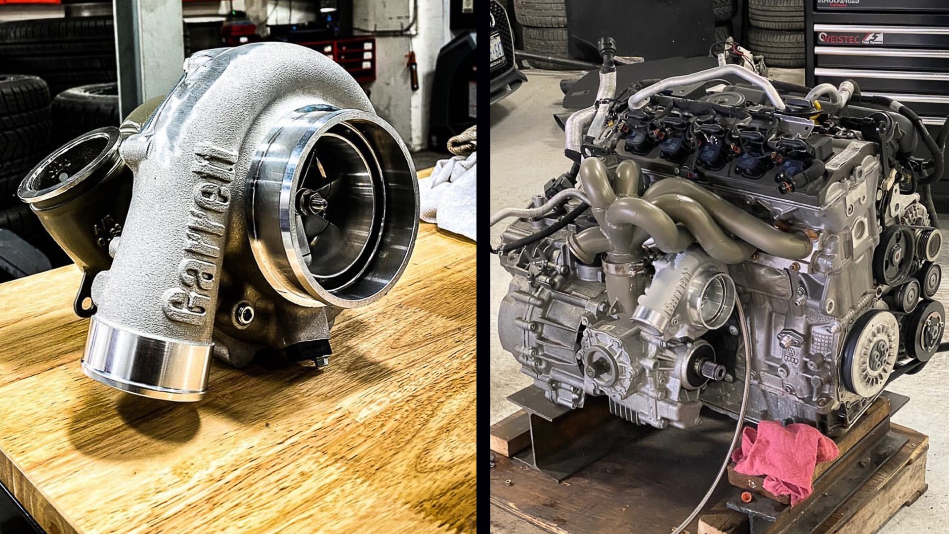 If you can imagine the engine bay in this car you probably know there’s not much room for anything extra, or even a larger turbo. That’s where Garrett engineers around the globe are smiling. The Garrett G Series G35-1050 is a 68mm turbocharger that can produce 1050 horsepower worth of air all in a compact package. Not to mention it comes in standard and reverse rotation or mirrored turbos depending on what you need to complete your build. This needed just one G35-1050 reverse rotation turbo to turn it into a #V8hunter! Reverse rotation turbochargers are mirrored copies of the standard rotation turbo. They spin in a counterclockwise rotation and the boosted air exits the turbo to the left. The compressor wheel, compressor housing, turbine wheel, and turbine housing are all engineered so the air flows the direction of the outlets.