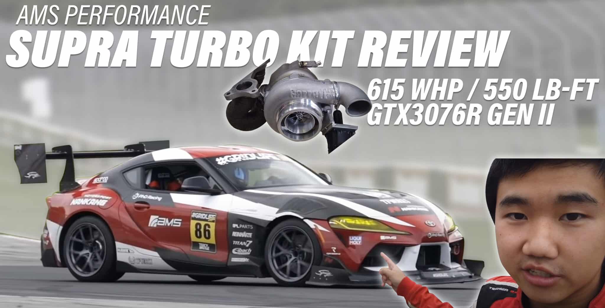 The A90 Toyota Supra is one of the hottest current vehicle platforms on the market thanks in part to its turbocharged inline 6 engine and rear wheel drive 8-speed transmission. The 3.0L BMW B58 engine platform boasts 382 horsepower from the factory at 6500 RPM and 0-60 mph in 3.9 seconds. Its closed deck, direct injection, 11.0:1 compression ratio block features 4 valves per cylinder and variable valve timing making this an extremely efficient engine. Efficient engines are even better with efficient turbochargers and that’s what Jackie Ding saw first hand when upgrading the factory turbo to the new AMS Performance turbo kit that uses the Garrett GTX3076R Gen II turbo.