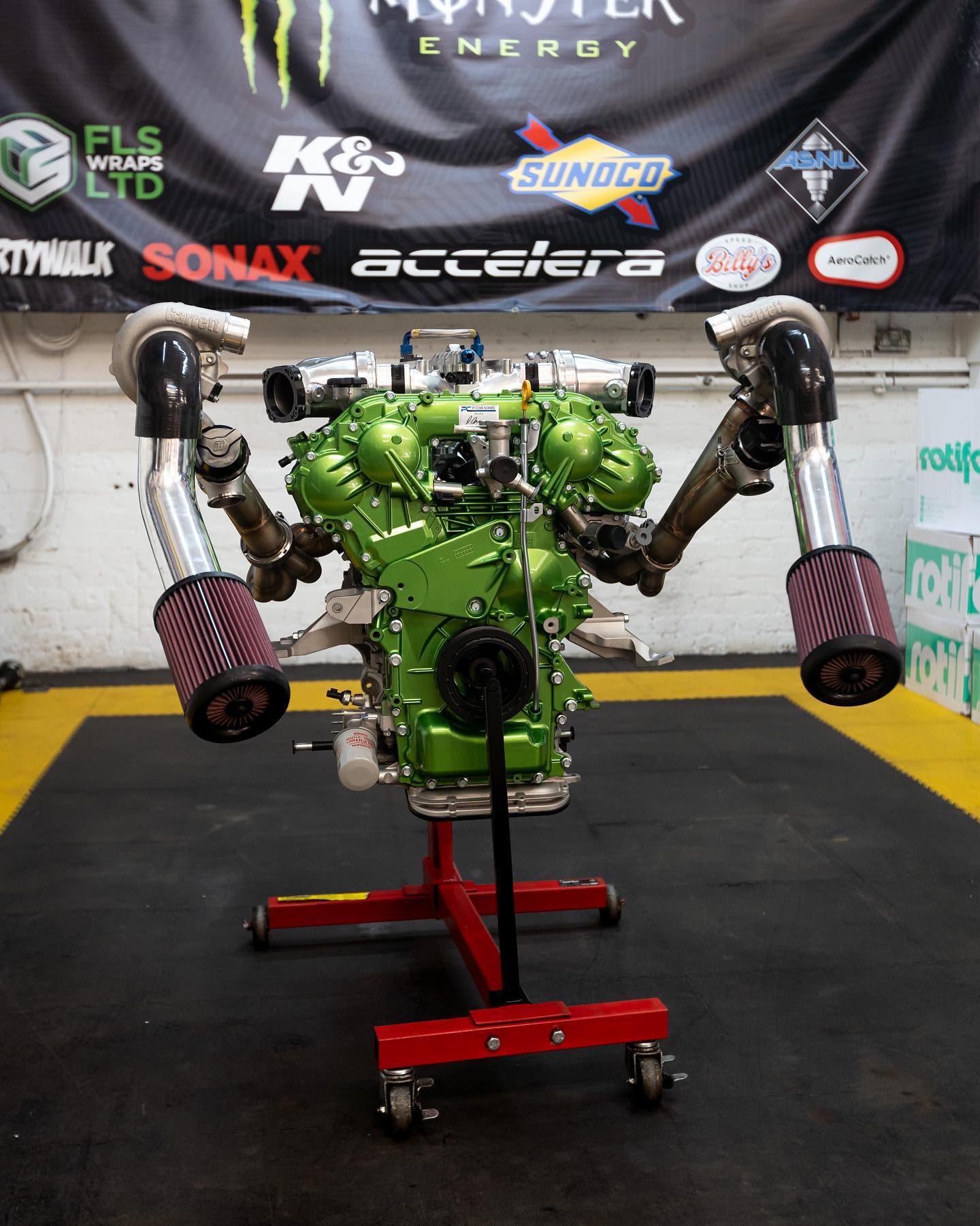 When paired with a standard rotation turbo, reverse rotation turbos offer builders and enthusiasts a wide range of options for creating equal length twin turbo systems. In the case of performance, air flow is critical to maintaining system stability and having equal length runners is one way to accomplish that. Aesthetical beauty is commonly the main factor when combining a standard and reverse rotation turbo together in one system. In the images below, you can see many different engine configurations utilizing both types of turbos to create the perfect turbo system. From exotics like the Lamborghini and Porsche, to modern imports like the S2000 and 370Z, and hot rods and muscle cars alike, turbochargers offer enthusiasts and kit builders many solutions to create their own masterpieces. These products are more are available at Garrett performance distributors worldwide. Please visit our distributor locator to discuss the proper turbo system for your build.