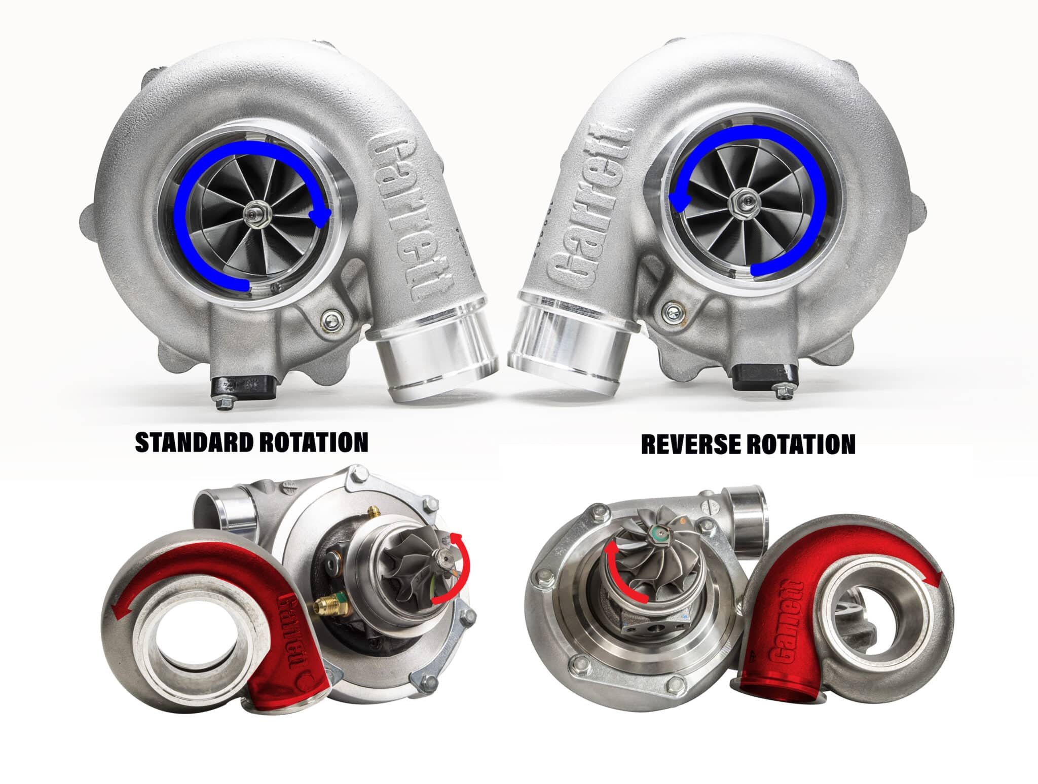 Reverse rotation, mirrored turbos, symmetrical turbos, mirror image turbos are the many names that identify this counter clockwise rotating turbo configuration. Truth be told, there’s nothing uber special about them when compared to their standard rotation counterparts. However, the only parts they share are the bearing cartridge and some bolts and clamps. Today we will look at the reverse rotation product line from Garrett and see what sizes and specs are available as well as give you some insight into the different application types that use these products.