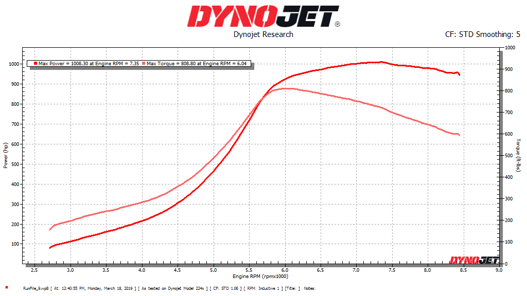 Once Ryan hit the Dyno, the team at FSR Motorsports and John Reed Racing got the car dialed in and made over 1000 horsepower to the wheels with 30LBS of boost! Look at the graph below.