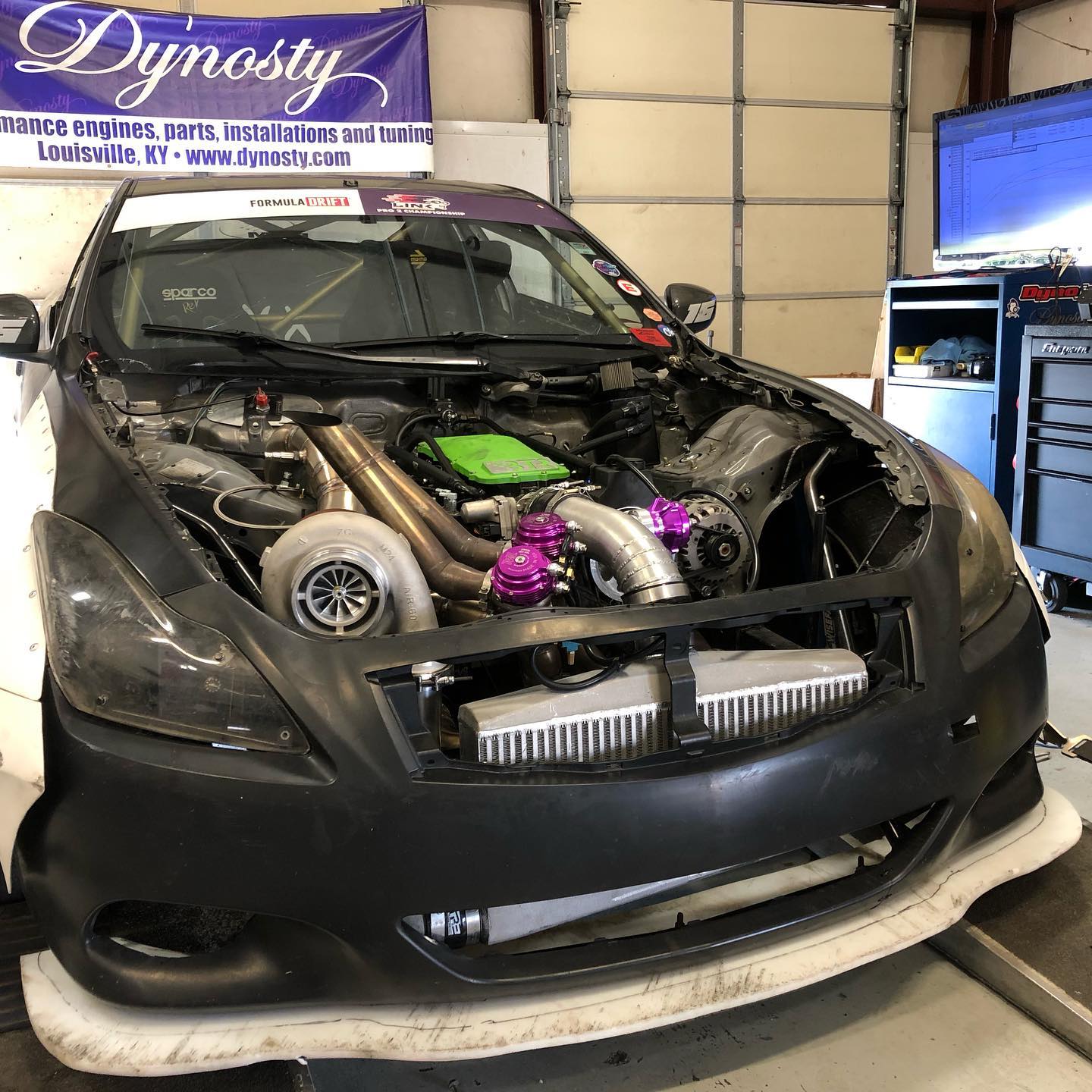 Infiniti G37 with a Mike Lough Racing Engines built 5.3L engine. Stock LS6 243 heads upgraded with BTR Racing dual valve springs and Compstar pushrods. Wiseco pistons, a BTR Racing Stage 3 turbo cam, and a K1 crank beef up the engine assembly. The BTR Racing Equalizer intake manifold outfitted with a stock LS2 DBW throttle body supply ample air to the engine. LSX innovations accessory drive brackets with F body spacing provide the clearance needed for the turbo kit to fit in the engine compartment. 3 Walbro 485 pumps (1 lift, 2 feed) and Fuel Injector Clinic FIC1650cc injectors supply the engine with Ignite E90 fuel. Twin 38mm wastegates are used to regulate turbo speed and a Haltech Elite 2500 ECU controls all engine calibration parameters.