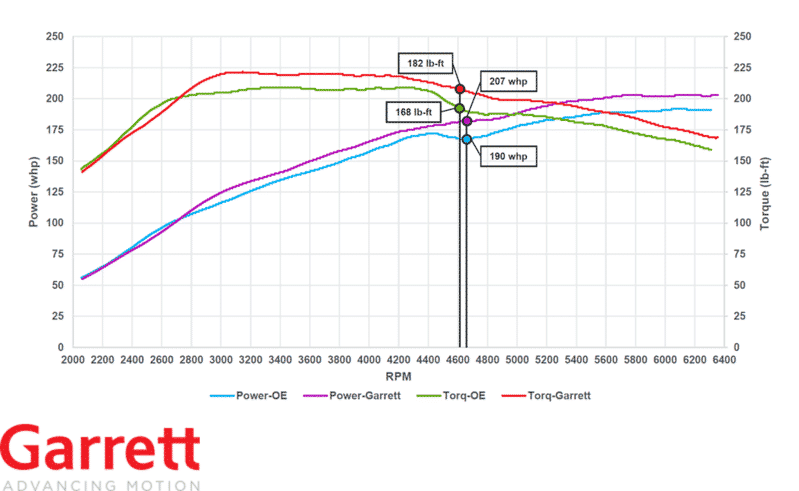So how much power does the Garrett intercooler make? The peak power gains are 17 hp and 14 lb feet of torque! What is more impressive is that the power gains come from 2700 rpm to the rev limiter at 6500 rpm. The power gains are pretty consistent across the rev range. This is a lot of power under the curve. Note that this is just by simply bolting on the intercooler with no tuning. With an intercooler this effective, tuning to exploit the significantly cooler charge air temperatures can probably extract at least another 20 hp without any other mods.