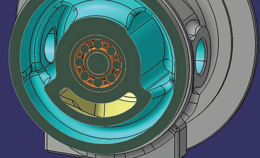 Turbo center housing shown in cutaway view, with water cavity (blue), oil cavity (yellow). Water cavity completely surrounds ball bearing cartridge (orange) and has a port on either side for water inlet & outlet.