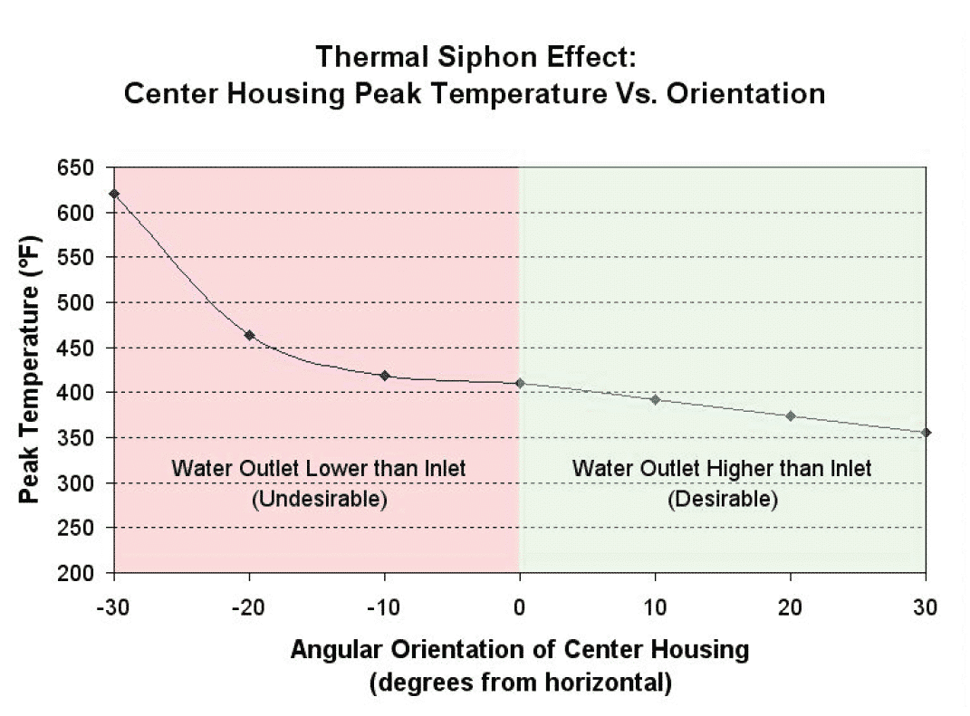 Graph showing center housing peak temperature vs. center housing orientation, as measured during heat soakback testing. Green zone to right shows lower temperatures resulting from proper water line setup, with outlet port higher than inlet. Red zone to left shows dramatic temperature increase as housing is rotated in the “wrong” direction, with the water outlet port lower than the inlet.