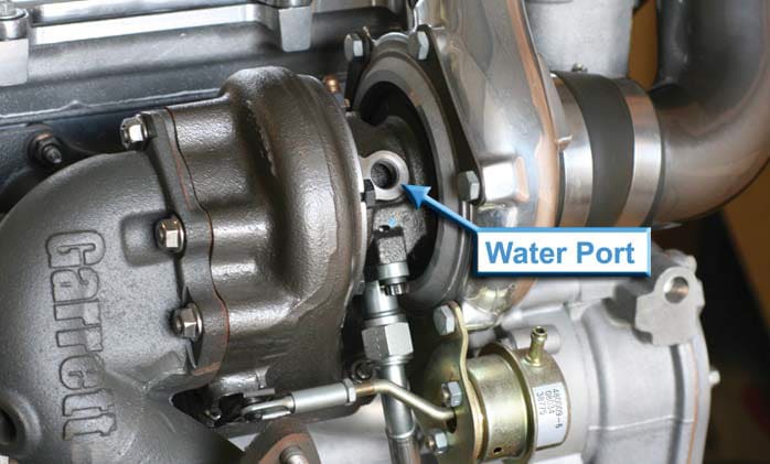 Water ports are located on either side of the turbo’s center housing. Water should flow through the center housing from right to left, or left to right. If there are more than two ports to choose from, be sure to use one on either side of the center housing (don’t plumb both lines in on the same side).