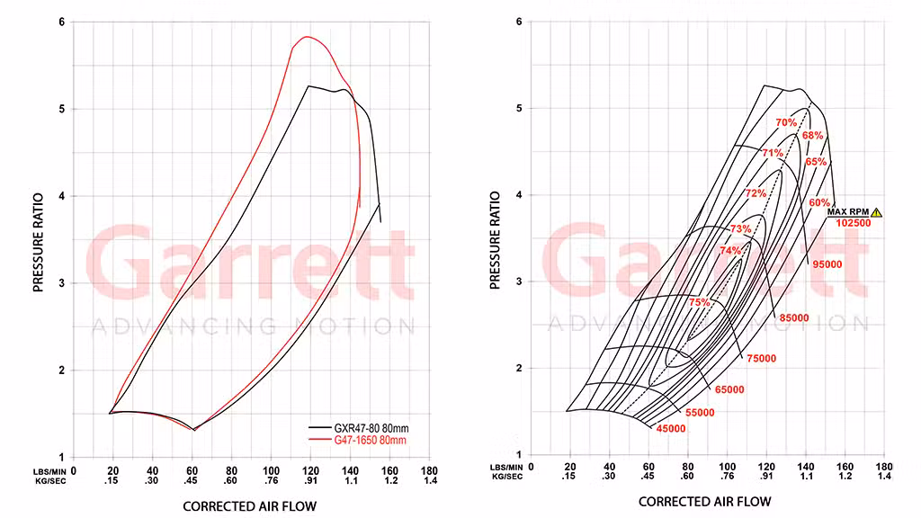 Testing results shown were achieved using the Garrett GXR47-80 configuration. Performance of other GXR47 variants, including the GXR47-76, will vary depending on compressor selection, engine combination, calibration, and vehicle setup.