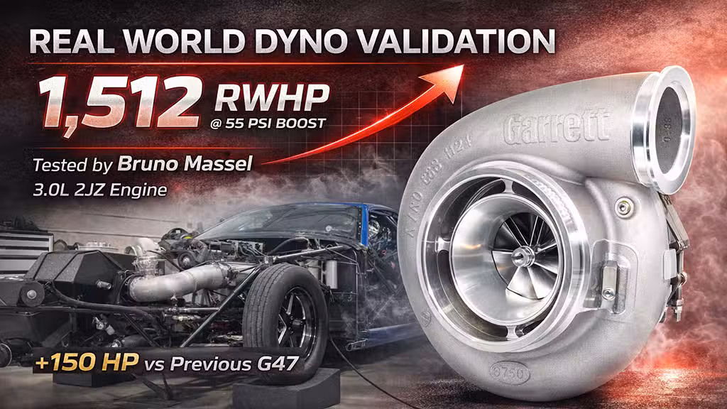 During dyno testing, the GXR47-80 produced 1,512 rear wheel horsepower at 55 psi of boost, even with approximately 10 percent converter slip. According to Bruno, the new GXR47 delivered approximately 150 rear wheel horsepower more than the previous G47 combination, with additional power still available in the setup.