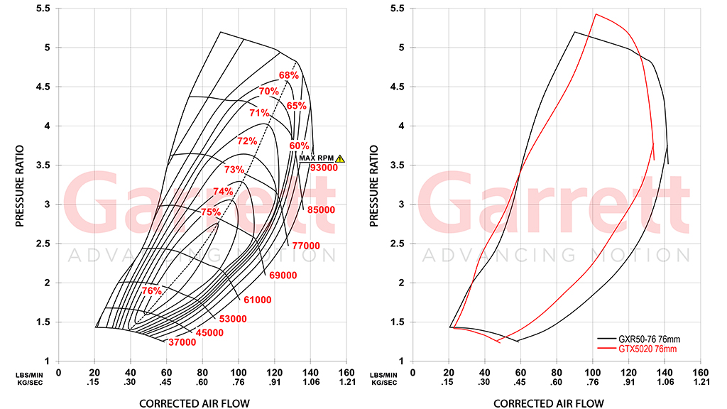 G-XRace turbochargers feature updated compressor aerodynamics that provide increased airflow and efficiency compared G-Series. These improvements expand the usable operating range and support higher horsepower and pressure ratio potential, where engine demand allows. The turbine wheel and turbine housings are the same and interchangeable between the two series.