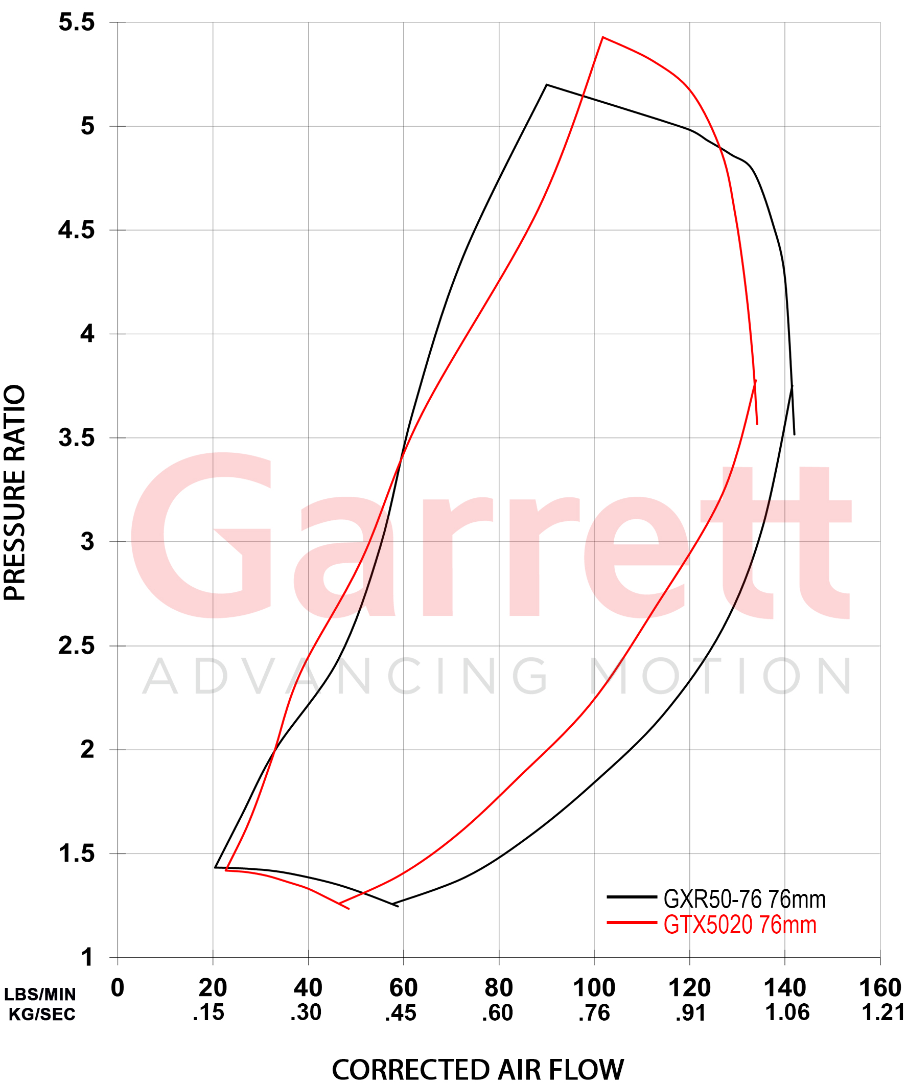 The compressor map overlay illustrates the airflow and pressure ratio differences between the G-XRace turbocharger and the G-Series design. In key operating regions, the G-XRace compressor provides increased airflow capability at comparable pressure ratios, expanding the usable operating range and supporting higher horsepower potential where engine demand allows.