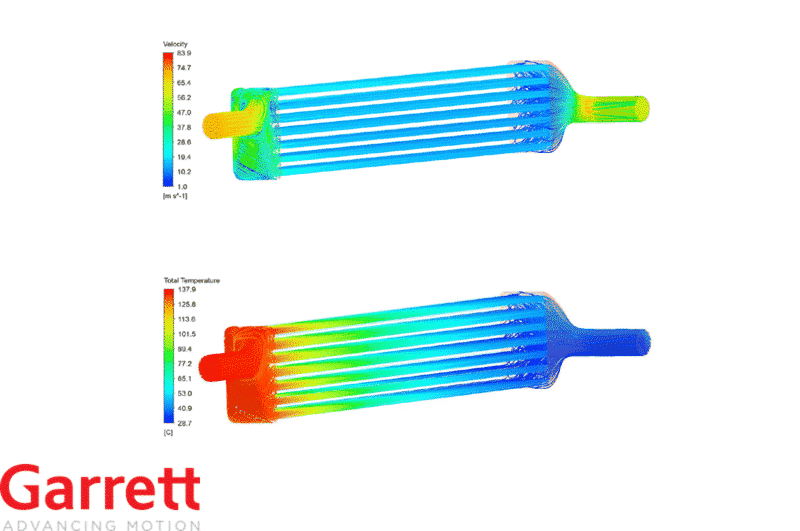 You don’t often get something for nothing. We tested the Civic Si intercooler from Garrett Advancing Motion and found that it worked spectacularly in reducing charge air temperatures and gave us great gains in power with no penalties! This is something worth noting as with ever evolving, well-engineered late model cars, it is getting harder and harder to extract significant gains in power with simple bolt-ons. The Garrett intercooler has smooth aerodynamically shaped cast end tanks for the best flow and the most even distribution of charge air flow across the intercooler core possible. This helps make cooling better and results in less pressure drop across the core. Garrett used CFD studies to determine the best end tank shape.