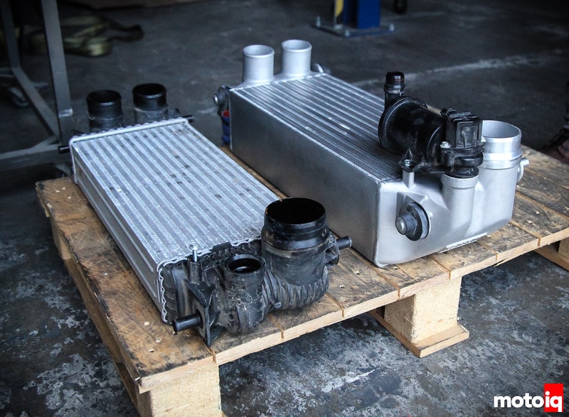 Comparing the stock intercooler to the Garrett side by side you can clearly see the massive difference in size between the two. You can also appreciate the smoother design of the end-tanks which will surely help improve flow. The thickness difference of the cores is obviously different too! Look at how thick the Garrett core is compared to the stock part.