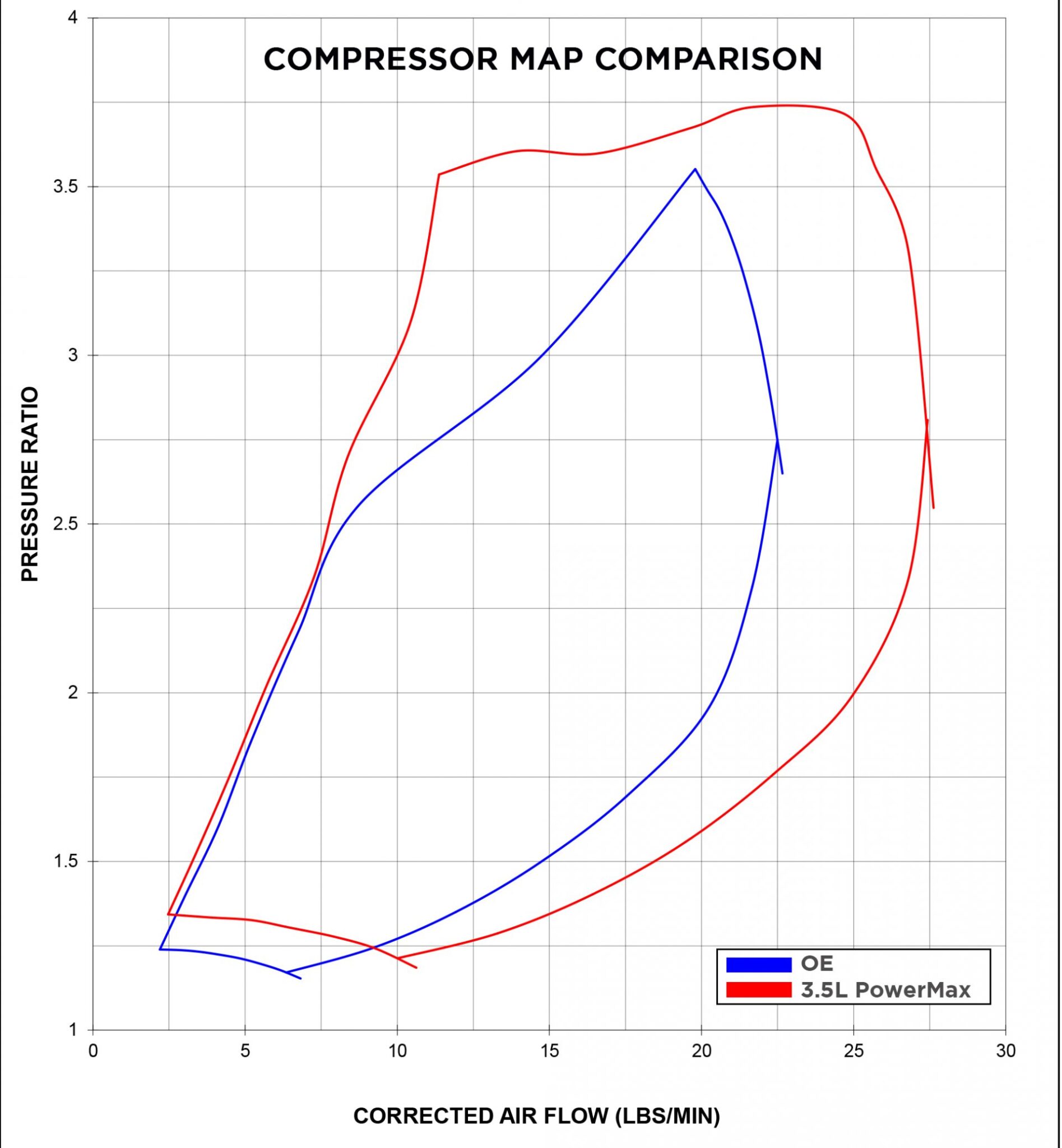 Turbocharger upgrades increase the size of the compressor wheel to flow more air at the stock RPM and boost pressures. This keeps the turbocharger in an efficient range, keeping air temps low while making more power continuously. Garrett has engineered an intercooler and twin turbo upgrade specifically for the 3.5L Ford EcoBoost engine platform.