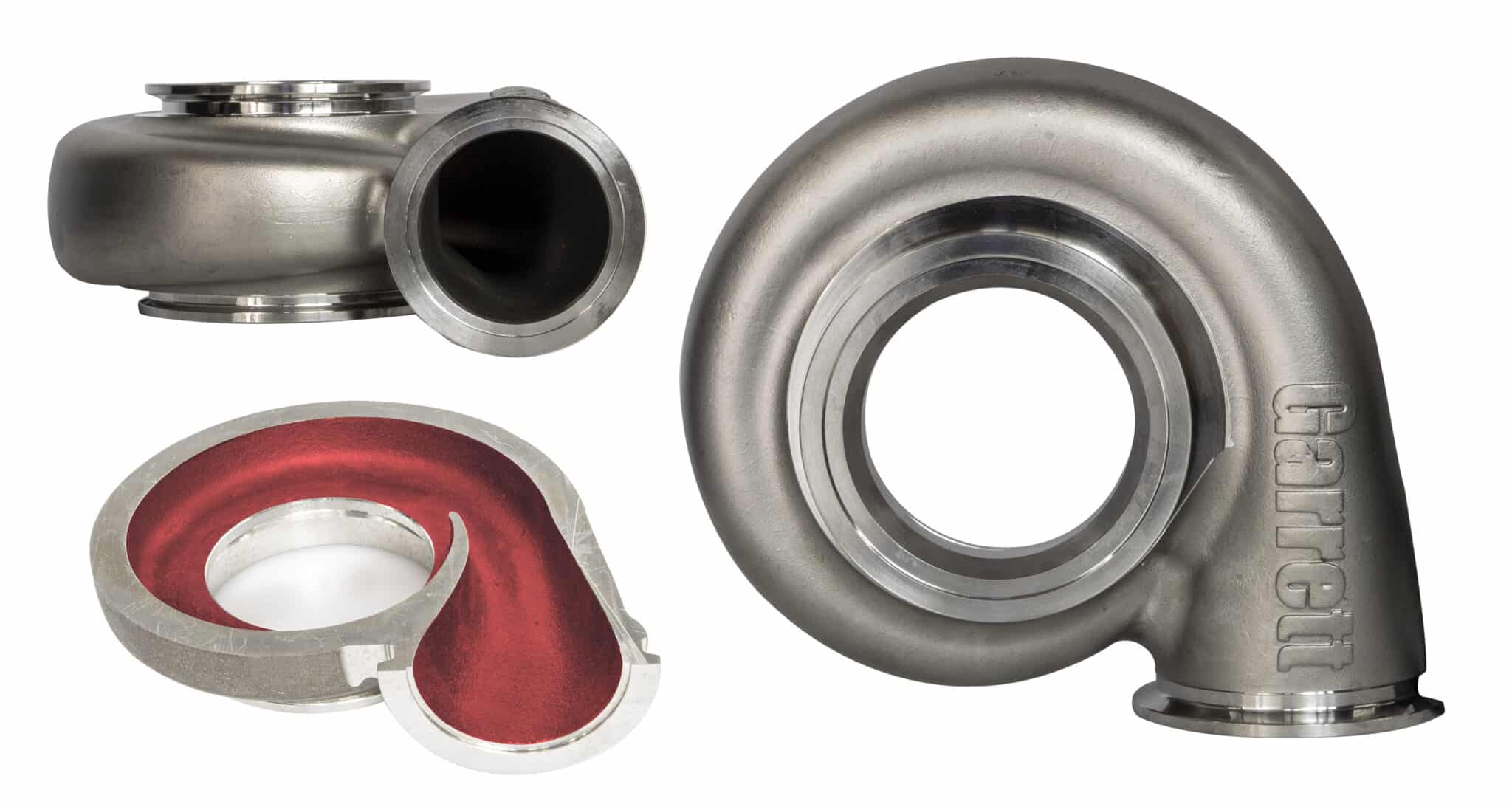 Turbine housing inlet flange– Depending on the size and manufacturer of the turbo, there are several types of turbine housing inlets, all with different dimensions. Smaller turbos use smaller inlet flange types like T25, while large turbos use larger flanges like T6. Garrett engineers flow test and match the turbine inlet size with the turbocharger’s performance specs. Garrett performance turbine housings are offered in T25, T3, T4, T6, and V-Band turbine housing inlet connections.