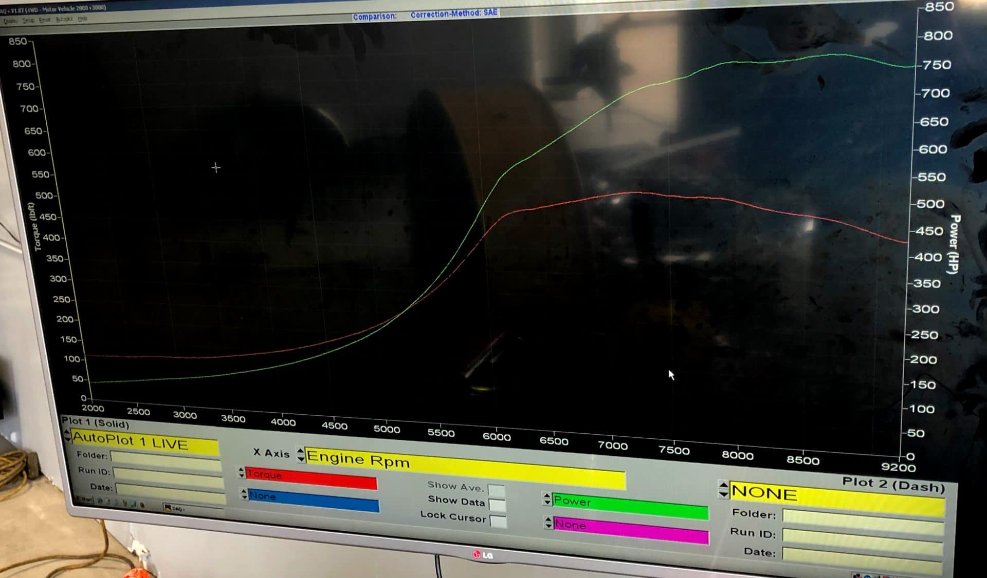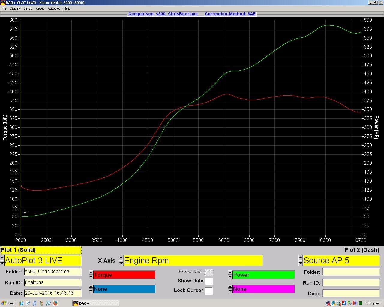 GTX3076R Gen II: made 605WHP@8400RPM and 400 FT/LBS@6200RPM with the .83 A/R divided housing, which was an improvement of 75WHP and 50 FT/LBS of torque over his previous Gen I turbo.