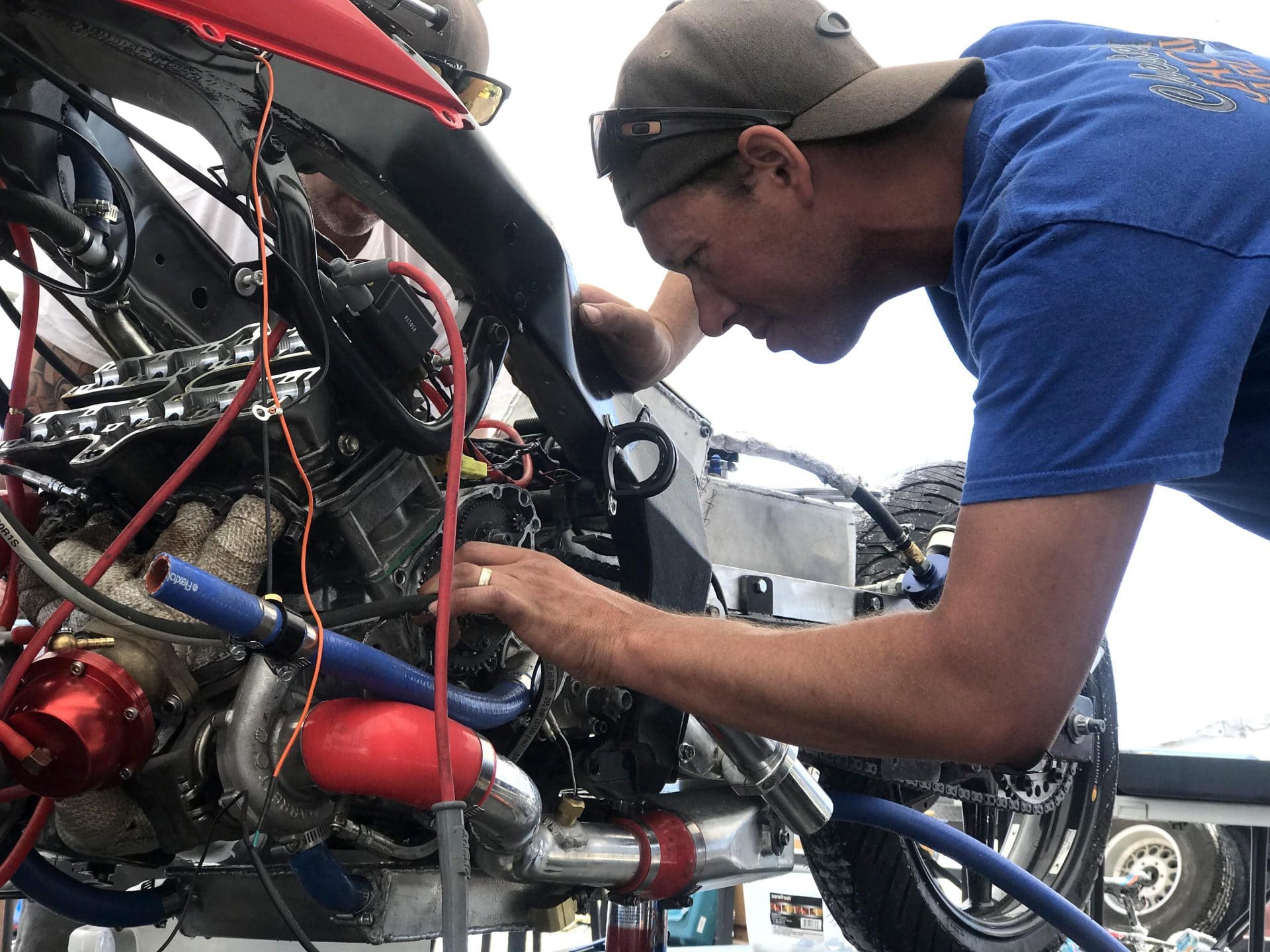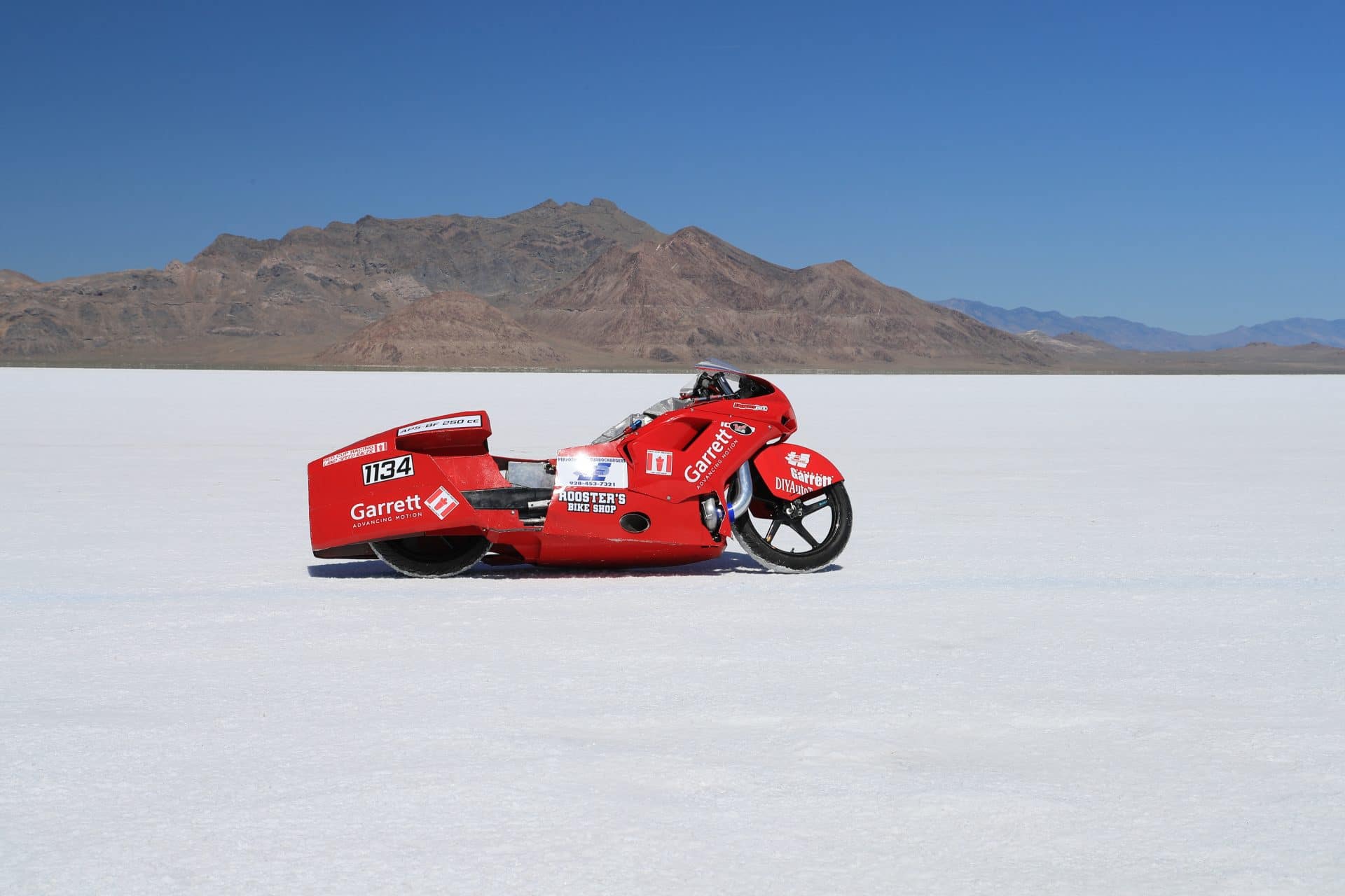 Rider and bike owner Nick says, “There’s a lot of team work that goes into making these races a success and a lot of it happens before we get out there. Without everyone’s support we couldn’t do it.Roosters Bike Shop is amazing and Ty can dream up anything and his ability to make it happen physically is why we all continue to make it to Bonneville every year. Thanks to Chopper from Limit and Garrett Turbo for making a great product”