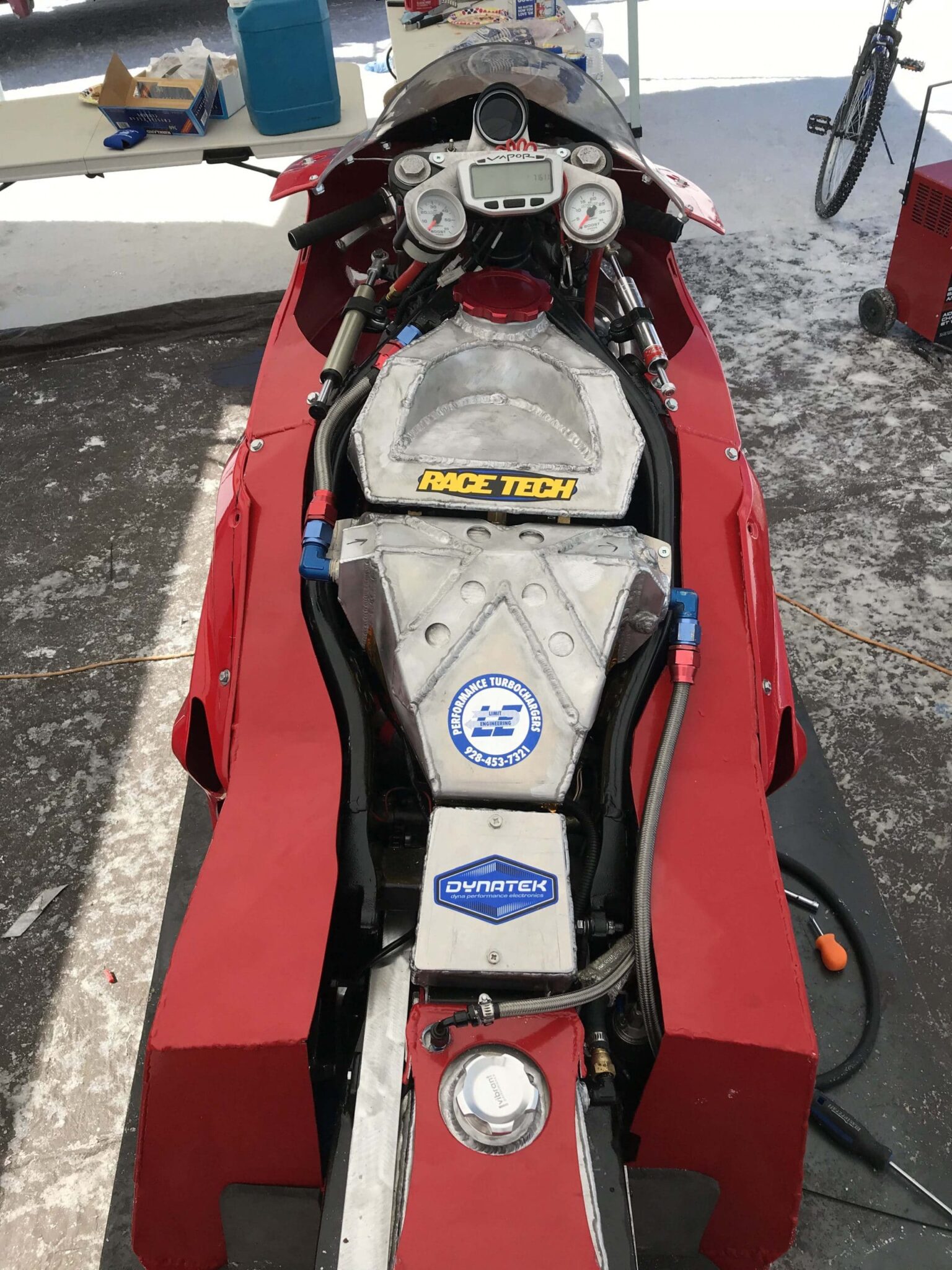 With a target speed of 200mph, this bike needed an update to the aero package which added some weight over the rear tire and gave the rider a lower center of gravity as well as reduced drag when tucked into his riding position. Tyrel removed the stock seat and replaced it with a fuel cell that sits above the swingarm, while a thin piece of aluminum and rubber pad is all that Nick Bouwmeester sits atop. The removal of the stock gas tank allowed space for the intercooler and icebox also placing the rider into a lower position on the bike. Lastly the rear tail section of the bike is built out of sheet metal and allows the riders feet to tuck into pockets reducing as much drag as possible.